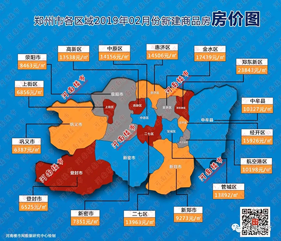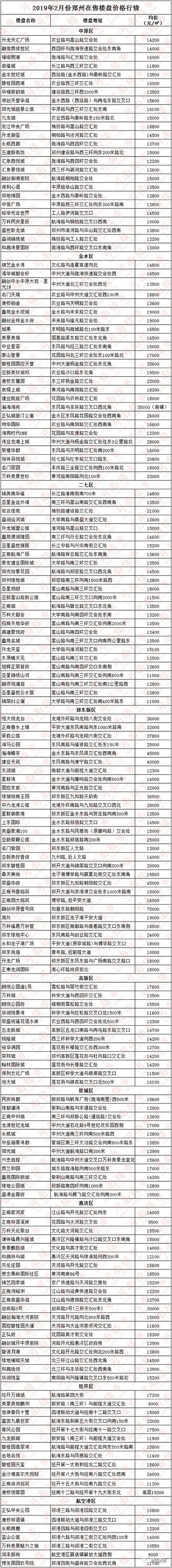 据河南楼市网数据研究中心统计显示,2019年2月份,郑东新区的房价以23843元/㎡领跑郑州市各个区域,金水区、经开区紧随其后,如上图所示郑州主城区多个区域房价均超过13000元/㎡,与2018年末相比房价变化趋势不大! 今日,河南楼市网联合郑州楼市网为您准备了2019年2月份郑州市在售楼盘均价,以便置业者参考置业,如有楼盘价格与实际不符者,请与我们联系,我们将及时更正!
