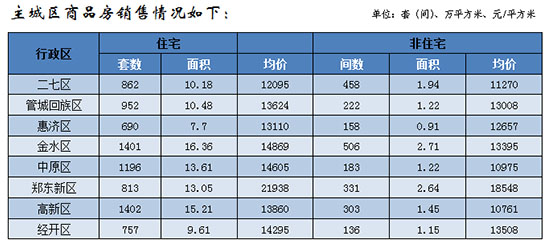郑州全市商品房销售19080套(间),销售面积209.11万平方米,销售均价11825元/平方米;其中商品住宅销售15501套,销售面积185.12万平方米,销售均价11944元/平方米。非住宅销售3579套(间),非住宅销售面积23.99万平方米,非住宅销售均价为10907元/平方米。