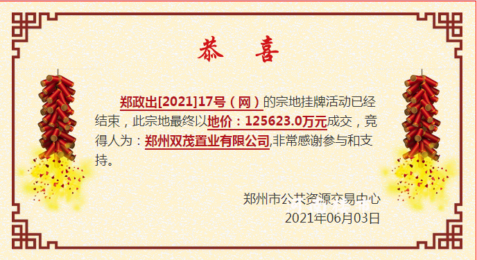 郑政出[2021]17号(网)地块成交(高皇寨村改项目【康桥天樾九章】),被康桥旗下郑州双茂置业有限公司以总价125623万元(底价成交)夺得,成交楼面地价为0.4万元/㎡,溢价率0%。