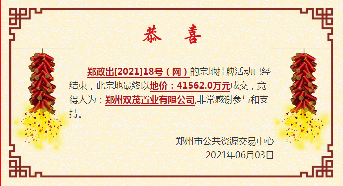 郑政出[2021]18号(网)地块成交(高皇寨村改项目【康桥天樾九章】),被康桥旗下郑州双茂置业有限公司以总价41562万元(底价成交)夺得,成交楼面地价为0.2万元/㎡,溢价率0%。